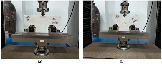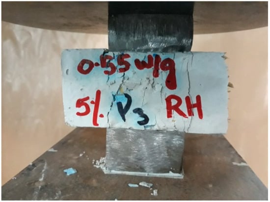 For the flexural and compressive strength tests, 160 mm × 40 mm × 40 mm prisms were prepared as shown in Figure 5 by following EN 13279-2:2014 []. Three prisms were prepared for each mix. After demolding, the samples were stored for seven days under 23 ± 2 °C temperature and relative humidity of 50 ± 5%. Then, the prisms were placed in an oven at 40 °C for 24 h and after that placed in air for cooling to room temperature. Three-point load tests were performed on these prisms for measuring flexure strength as per the procedure described in EN 13279-2:2014 [] by using a TIRAtest 2810 universal testing machine with a load capacity of 10 kN (see Figure 6a). The test was conducted at a loading rate of 10 N/min. The pins used at supports had a 10 mm diameter as per standard to avoid local stressing of load at supports. The pins were placed at 100 mm center to center distance with the help of a graduated platform for supporting pins at exact locations. The data of the flexure test generated load-deflection curves for each test specimen. The corresponding flexure strength was calculated using Equation (2).