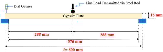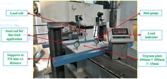 As a potential eco-friendly construction product for the developed gypsum composites, the gypsum false ceiling plates with dimensions 600 mm × 600 mm × 15 mm were prepared for each mix as per the EN 14246:2006 [] standard, which establishes the minimum requirements for the design of gypsum false ceiling plates in discontinuous false ceilings as mentioned in Table 4. The most common dimensions of discontinuous false ceiling plates used in the local construction industry are 600 mm × 600 mm × 15 mm. The plates were prepared by using the same method of casting as used by local plate manufacturers, which involves pouring the wet mix into molds with the bottom surface made of glass and leveling the top surface with a sharp edge without applying any pressure during casting. The casting setup used for this study and a freshly cast and finished gypsum plate are shown in Figure 8. For each gypsum composite, three plates were prepared. The bending test was carried out on developed plates to calculate breaking loads and to check the post-peak behavior of false ceiling plates, which was expected to improve due to incorporating wheat straw and rice husk in the mixes. As a passing criterion as per EN 14246:2006, a line load of 6 kg was applied to each plate at its center for 30 min and the development of any permanent cracks on the bottom side of the plate was observed. All the plates made in this study passed this check. Then, a constantly increasing line load at a rate of 0.1 mm/min was applied on the plate until it broke. Along with the load measurements, the midspan deflection of the plate was also measured to plot the load-deflection curve to confirm the post-peak behavior and to calculate the energy dissipation capacity of the developed gypsum composites. The schematic diagram of the test setup used is shown in Figure 9 whereas the actual test setup is shown in Figure 10.