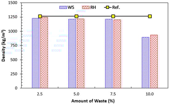 Figure 11 presents the density comparison of each gypsum mixture with the control gypsum mix. An increase in the percentage of both agricultural residues (wheat straw and rice husk) caused a reduction in density values compared to the reference gypsum mix. A reduction of 29% and 26% in density values is observed compared to the control gypsum matrix with a 10% dosage of wheat straw and rice husk, respectively. The reduction in density is observed because both agricultural by-products have a significantly lower density than gypsum. Further, a higher value of the W/G ratio is responsible for the increased reduction in density values for the case of composites with 10% agricultural residues. The coefficient of variation (CoV) for the density test on gypsum composite specimens is below 5%.