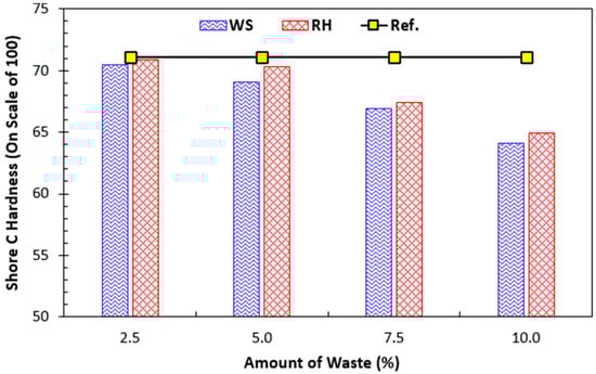 The results of shore C hardness tests are presented in Figure 12. It is evident that the replacement of gypsum with agricultural wastes caused a decrease in shore C hardness of gypsum composites. The shore C hardness values showed a decreasing trend with the increase in residues’ dosage. However, the difference in values is not significant as the waste percentage increases from 2.5 to 10 percent. The composites containing wheat straw show a slightly lower value of shore C hardness compared to those having rice husk, which is due to the higher stiffness of rice husk particles. The CoV for specimens tested in shore C hardness is below 10%.