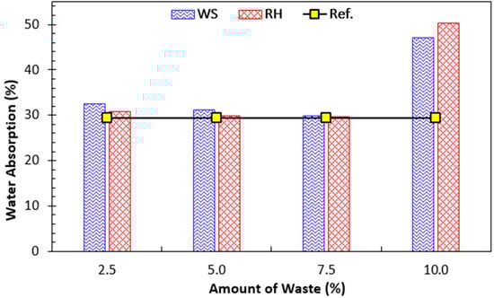 The results of the water absorption test for all the composites investigated in this study are shown in Figure 13. The water absorption values for gypsum composites with an agricultural waste dosage of up to 7.5% are close to the reference specimen because all these mixes have a water/gypsum ratio of 0.55. However, in the case of gypsum composites with 10% agricultural residue dosage, the water absorption values show an increase compared to control gypsum composites due to the availability of excess water and hence porosity because of the greater water gypsum ratio of 0.8. Further, more exposed residue particles on the sample’s surface are another reason for the increased water absorption in the case of mixes containing 10% waste. No thickness swelling was observed for samples of any mix as a result of this 24 h immersion. The CoV for gypsum composite samples in the water absorption test is below 5%.