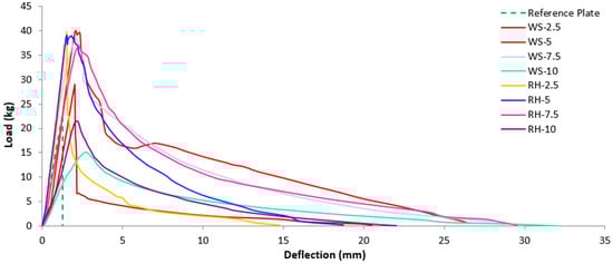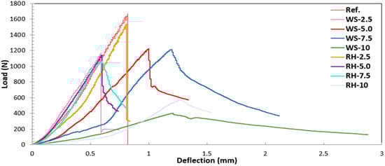 As mentioned in the previous section, all the plates passed the bending test of carrying a 6 kg centered linear load for 30 min as per European standard EN 14246:2006 []. The complete load-deflection curves for the plates made of all the mixes are shown in Figure 21. The reference plate (0% waste dosage) failed suddenly after reaching the peak load, showing the brittleness of the reference mix. However, for the plates made of the other developed composites, an improved load-carrying capacity and the post-peak behavior are evident in these curves as compared to the reference specimen.