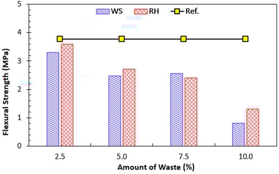 The load-deflection response of all the prism specimens tested in flexure is shown in Figure 14. The control mix prisms (0% waste dosage) suddenly failed under the gradually applied load after reaching a maximum load, showing the brittle nature of the reference mix. However, with the addition of both types of agricultural residues, the prism specimens showed improved post-peak behavior. Although the ultimate load carried by the prisms decreased with the increase in waste percentage, the ultimate deflection of the prism before failure increased as shown in Figure 14. In Figure 15, the crack planes of the tested gypsum prisms obtained because of the flexure strength test are shown. The crack planes of each gypsum prism show the homogenous distribution of wheat straw and rice husk across the cross-section. Grains of both types of residues were uniformly surrounded and separated by gypsum. Figure 16 shows the ultimate flexural strength values for all the mixes studied. A decreasing trend in flexure strength with the increase in agricultural wastes’ dosage can be observed, which is due to the decrease in the quantity of the binder in mixes containing waste dosages up to 7.5% and also due to a higher W/G ratio for mixes containing a 10% waste dosage. However, flexural strength values of all the mixes remained above the minimum limiting mean value of 1 MPa [], except for the prism specimens with a 10 percent wheat straw replacement level. The CoV for specimens in the flexure strength test is below 10%.
