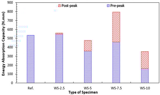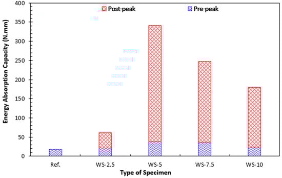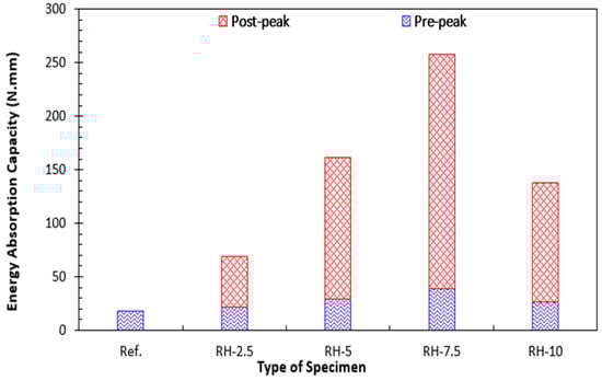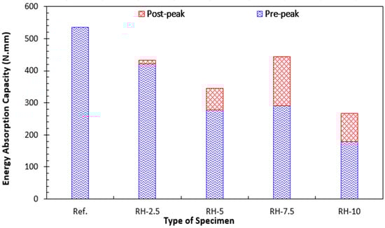 To quantify the effect of incorporating agricultural wastes on the post-peak behavior in flexure of the developed gypsum composites, the energy absorption values were calculated from the load-deflection curves presented in Figure 14 by calculating the area under the curve. Two energy values were calculated for each composite, i.e., energy up to the peak load (pre-peak) and the energy absorbed in the post-peak range. The results of energy absorption in flexure by the gypsum composites incorporating wheat straw are shown in Figure 17. The pre-peak values of energy absorption of samples containing wheat straw up to a dosage of 7.5% are close to the control gypsum prism (0% waste) values but decrease when 10% wheat straw is added. Figure 18 shows the results of energy absorbed in flexure for the composites containing rice rusk. Gypsum rice husk prisms show smaller deflections compared to gypsum wheat straw prisms because rice husk is smaller and stiffer compared to wheat straw.