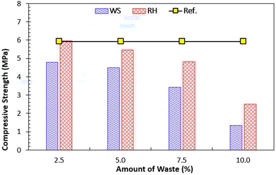 Compressive strength values for all the composites are shown in Figure 19. The compressive strength values are decreased due to the addition of waste and show a decreasing trend with the increase in the replacement ratios of both the wastes. However, these values of compressive strength remain above the minimum limiting mean value of 2 MPa [], except for the prism specimens with a 10 percent wheat straw replacement level. The CoV for specimens tested for compressive strength is below 10%. It should be noted that for gypsum mixtures containing rice husk as a replacement material, the compressive strength values are higher than gypsum mixture with wheat straw, which is due to the higher stiffness and rough surface of the rice husk particles.