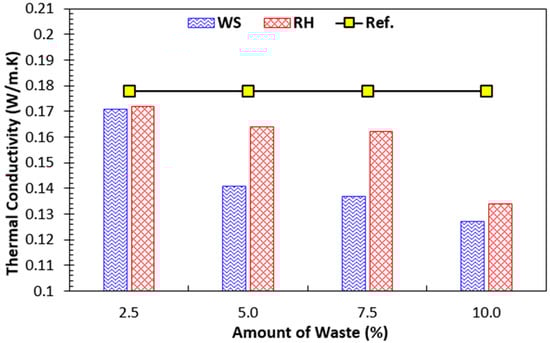 The thermal conductivity plates were placed in between the hot and cold plates of the guarded hot plate apparatus (see Figure 4). The plate heat flux (W/m2), plate thickness (m), and average temperature difference between two sides of the plates (°C) are determined to measure the thermal conductivity. The results of thermal conductivity obtained by performing the test according to EN 12667:2001 [] in guarded hot plate apparatus on gypsum plates measuring 300 mm × 300 mm × 15 mm are shown in Figure 20. It is evident from the results that the thermal conductivity of the composites decreases with the increase in the percentage of waste, therefore providing superior thermal performance for the developed composites. At the same waste dosage level, gypsum plates containing wheat straw showed better performance compared to the gypsum rice husk plates. Gypsum plates with 10% of wheat straw achieved the lowest density, i.e., 898 kg/m3 as well as the lowest thermal conductivity, i.e., 0.127 W/m·K, which is 29% lower than the reference gypsum plate. The improved thermal insulation of the developed composites as compared to the reference mix is encouraging for the utilization of the agricultural waste to develop eco-friendly gypsum composites for use in buildings as an insulating material.