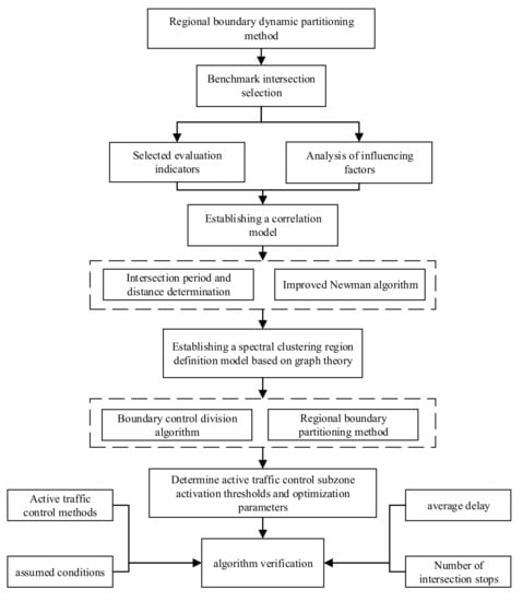 The implementation of active traffic control systems is predicated on the dynamic establishment of regional boundaries [13]. The analysis takes into consideration the regional road network structure [17], urban road classification, real-time traffic flow, and other factors, and defines the regional boundary by determining the active traffic control thresholds and correlation degree-influencing factors based on the road network within its own conditions. The research idea of this paper is shown in Figure 1.