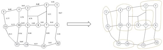 In the preliminary definition, this paper is used to improve the Newman algorithm. First, the road network is initially divided into n communities, and each node in the network of communities represents a community, denoted as . The n-order symmetric matrix is defined as , for which is the edge weights of the edges connected between community and community , indicating the proportion of the internal edge weights of the community in the total edge weights of the network. The sum of the elements of each row of the matrix is , which represents the proportion of the edge weights of the internal nodes of the community connected to the external nodes to the total edge weights of the network. represents the sum of all elements of the matrix . This obtains the modularity of the entitled network as shown in Equation (7).