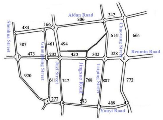 To evaluate the effectiveness of the dynamic area definition approach, which is compared to the traditional intersection cluster hierarchical clustering algorithm [11] and the boundary control subzone delineation method [14]. As illustrated in Figure 4, the approach chose a city’s main metropolitan road network as an example in space, which includes 15 signal intersections and 29 road sections, with road network structures and intersection distances ranging from 160 to 950 m. The transition phase from flat to peak is selected for algorithm validation in time.