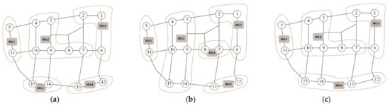 Then, the similarity matrix of each intersection is calculated, combined with the spectral clustering algorithm to calculate the vector, and then searched according to the heuristic rules to obtain the optimal congestion control boundary division scheme of the road network, as shown in Figure 5a. The regional boundary is divided using the intersection cluster hierarchical clustering algorithm based on multiple characteristic factors and the boundary control subzone division method, and the division results are shown in Figure 5b,c. Next, the active traffic control situation is analyzed using each of the three boundary delineation results to determine which division method is most suitable for active traffic control.