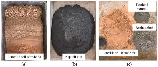 Materials testing (a) Lateritic soil (Grade E) (b) Asphalt waste dust (c) Mixing samples of Lateritic soil (Grade E), asphalt waste dust and Portland cement.