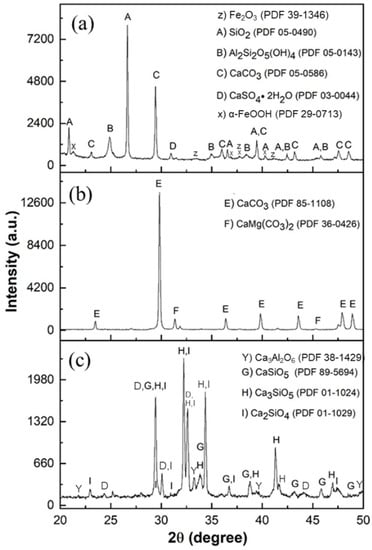 From Table 4, Portland cement is composed of 67.4 wt% CaO, 3.6 wt% Al2O3, 15.7 wt% SiO2, 3.2 wt% Fe2O3, and 10 wt% of other trace oxides, including MgO, MnO2, SO3, and K2O. The XRD patterns in Figure 2c reveals high CaO in the major-mineral forms of Dicalcium silicate (Ca2SiO4 or C2S), Tricalcium silicate (Ca3SiO5 or C3S), Tricalcium aluminate (Ca3Al2O6 or C3A), Calcium silicate oxide (CaSiO5), and Calcium sulfate or gypsum (CaSO4·2H2O) in Portland cement. These all components are well-known precursors of hydration reactions in the hydrated cement powder.