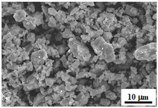 The average particle size of asphalt waste dust was about 9.86 µm, which was consistent with the result of the sieving method. The plastic index of the asphalt waste dust cannot be determined since asphalt waste dust itself cannot be molded to evaluate the plastic limit. This ensures a non-plastic character and low water-holding capacity of asphalt waste dust. Asphalt waste dust included more than 80% CaO as its major component (Table 4). Highly detected CaO was associated with the existence of calcium carbonate (CaCO3) as the major composition, and the mineral dolomite (CaMg(CO3)2) as a minor detected composition (Figure 2b). These chemical and mineral compositions also confirmed it to be ab environmentally friendly material for recycling asphalt waste dust in many applications. Moreover, the XRD analysis of the asphalt waste dust revealed the highest reflection peak at 2θ degrees around 28.5˚, which corresponded to the (104) crystal plane. This reflection plane represented a rhombohedral calcite structure of CaCO3, which is the thermodynamically most stable form of CaCO3 at room temperature [18]. The morphological image in Figure 3 shows that the asphalt waste dust particles have a variable size distribution and an angular shape. However, the particle size was rather small, approximately below 10 µm, which was consistent with the findings of the laser particle size analysis.