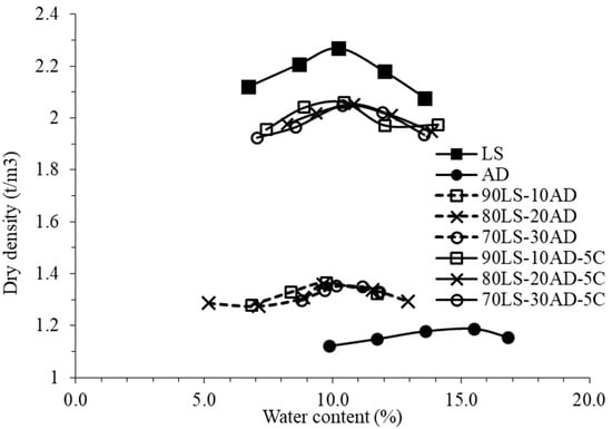 Dry density and water content of LS, AD, 90LS-10AD, 80LS-20AD, 70LS-30AD, 90LS-10AD-5C, 80LS-20AD-5C, and 70LS-30AD-5C samples were determined by the modified proctor compaction (AASHTO T 180) [21] to obtain the maximum dry density and the optimal water content of those samples. The optimal water content was subsequently used for California bearing ratio testing.