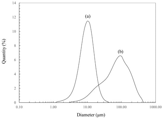 Particle size distribution curves of (a) asphalt waste dust and (b) lateritic soil.