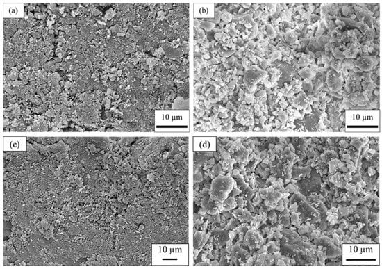 The microstructures of the soaked lateritic soil-mixed asphalt waste dust samples after the CBR test are shown in Figure 8. The surface of the 90LS-10AD sample was found to be better compacted with 10 wt% asphalt waste dust (Figure 8a,b). This was influenced by the filling effect of fine asphalt waste dust in compacted soil particles. However, 10 wt%-asphalt waste dust was not enough to improve the strength of the lateritic soil, and therefore the CBR values and the overall microstructure of the 90LS-10AD samples were almost the same as the compacted pure lateritic soil samples (Figure 7a,c). When increasing the asphalt waste dust to 20 wt% in the lateritic soil mixes, the microstructure of the compacted 80LS-20AD samples resembled that of the compacted non-plastic materials. The small crevasses were observed in between the clusters of compacted particles (Figure 8c,d).