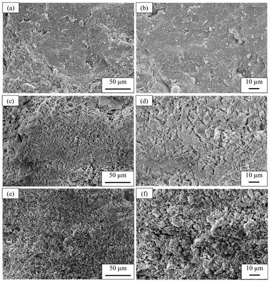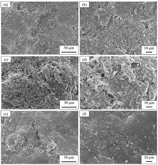 Figure 9 shows the microstructures of the soaked lateritic soil-mixed asphalt waste dust with the addition of 5 wt% Portland cement. With the presence of a small amount of cement, the lateritic soil-mixed asphalt waste dust samples were much more compacted than the other samples with none of the cement. Especially in the sample with higher asphalt waste dust, the compactness was much more developed with the addition of cement powder. As seen in Figure 9e,f, a very dense surfaces without porosity and air voids were achieved in the 70LS-30AD-5C samples compared to the other samples in Figure 9a–d. According to Table 5, the plasticity index values of the lateritic soil samples with increasing asphalt waste dust were improved by the cement addition (≤11 for the subbase course of DOH [19]). This was attributed to the development of stiffness in those lateritic soil samples due to the reaction between cement and water, and thus deteriorated soil plasticity [33]. The filler-like properties of fine asphalt waste dust also promoted the compacted area for the complete hydration process and increased the cohesiveness and uniformity of the lateritic soil samples. Fine asphalt waste dust could physically disperse cement particles, thus freeing more water to react with cement powder [18]. Moreover, the fine asphalt waste dust was able to fill the air voids and reduced the inter-particle fraction of compacted soil to increase the soil strength. As shown in Figure 6, the CBR values of the 70LS-30AD-5C sample were much highly improved, and a very high compact microstructure was achieved, as demonstrated in Figure 9e,f. It was implied that the presence of fine asphalt waste dust with a small amount of cement could simultaneously promote particle packing and hardening effect between the lateritic soil and cement in the 70LS-30AD-5C samples.
