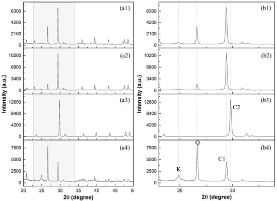 XRD pattern of (a1,b1) 70LS-30AD-5C and (a2,b2) 70LS-30AD samples in comparison to (a3,b3) asphalt waste dust and (a4,b4) lateritic soil samples after CBR test: (a) the broad 2θ range = 20–50˚ and (b) the narrow 2θ range = 24–31˚ (K = kaolinite (PDF 05-0143), Q = Quartz (PDF 05-0490), C1 = Calcite (PDF 05-0586), and C2 = Calcite (PDF 85-1108)).