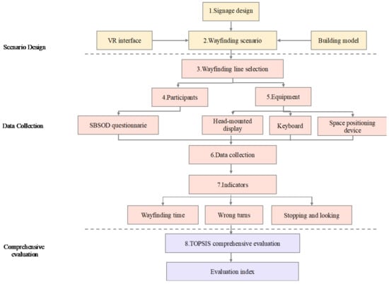 In fact, the evaluation method based on the wayfinding theory is one of the main methods used to evaluate signage. Wayfinding can be described as a process by which people try to orient and navigate themselves in an environment with the objective of finding their way to destinations [,] and performing the inverse process of finding their way back []. The basic process of wayfinding involves four stages []: