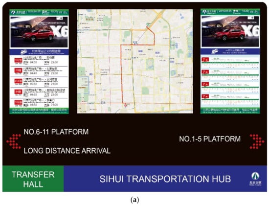 Based on its functions, signage could be divided into direction signage, location signage, and integration information signage in China based on the standard of DB11/T657-2014 []. As a supplement to direction signage and location signage, integration information signage provides information about directional maps, transfer stations and available services in the forms of pictures and texts. In addition, integration information signage has the advantages of more abundant guiding information and flexible settings. Although some standards guide the design of direction signage and location signage, such as GB/T-20501-2013 [], no standards have been developed for the design of integration information signage. Unfortunately, this absence leads to unreasonable and inconsistent designs. For example, the signage cannot be closely coordinated, and the signage is set in inappropriate positions with incoherent information, resulting in inefficient wayfinding for passengers. Even during emergencies, badly designed signage can be a potential danger for people in extremely stressful situations []. On the contrary, comprehensive integration information signage can ensure that people get clear spatial identification and orientation in unfamiliar urban transport hubs, which can not only ensure that people’s activities are in order but also facilitate the safe evacuation of personnel in the cases of disasters. A place with well-established signage brings people safety and, more importantly, gives them a wonderful journey experience that will stimulate them to visit the place again []. Therefore, effective signage is necessary to guide passengers in finding their destinations. To standardize and unify integration information signage, it is indispensable to conduct research on the methods of its optimization and evaluation.