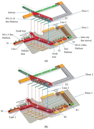 In this study, according to the above selection principles, two lines were selected to conduct the wayfinding experiment. The lines are shown in Figure 3. Line 1 (as shown in black) started from the NO.5 bus platform (“S1” point) and ended at the inter-city bus arrival platform (“E1” point), passing through the NO.5-1 bus platform, north exit, transfer hall, south exit, and NO.7-11 bus platform. Line 2 (as shown in blue) started from the taxi platform (“S2” point) and ended at the NO.16 bus platform (“E1” point), passing through the NO 8-7 bus platform, south exit, some stairs, and the NO14-16 bus platform. In addition, both the starting and ending points of line 1 were located on the first floor, while the starting and ending points of line 2 were located on floors one and two, respectively.