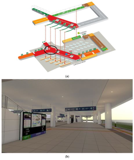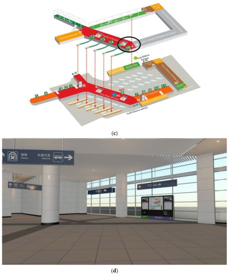 The core of a VR system is a high degree of integration among immersion, interaction and a sense of presence. Oriented by user perspectives, the system can track and reflect users’ movements in a 3D environment. In addition, with the help of hardware and software devices, it enables users to be fully immersed in scenarios. Specifically, the degree of immersion is related to the amount of stimulation of the user’s sensations and the similarity between the simulation environment and real ones []. The VR simulation environment has the potential to simulate the movement of pedestrians in various movement patterns and travel scenarios []. In a VR environment, passengers’ perceptions and wayfinding performances can be collected. At the same time, different signages could be selected and optimized in the experiment. As a research platform, VR systems can help conduct multiple-factor experiments with different signage designs; it is also a great tool for analyzing signage design and settings due to its interference-free feature.