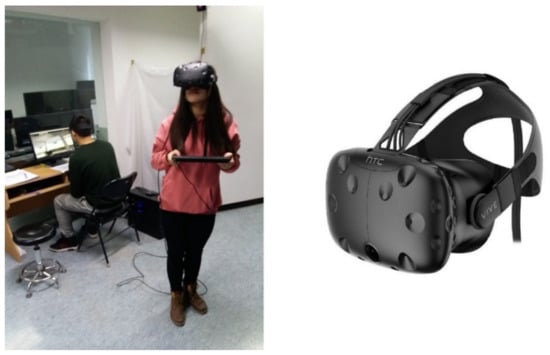 This step is shown as step 5 in Figure 1. To describe participants’ wayfinding behavior, excluding other interference factors, the virtual reality equipment of HTC VIVE (see Figure 5) was used in the experiment. The virtual reality equipment included a headset with virtual reality glasses, a keyboard, and space-positioning devices. The resolution ratio of the virtual reality glass, which employed a Steam VR tracking technology, was 2160 × 1200 pixels, and the fresh frequency was 90 Hz, with the visual angle being 110°. In the virtual reality environment, participants could move by controlling the arrow keys on the keyboard, which employed Steam VR tracking technology. During the experiment, stopwatches and counters were used to record the data.