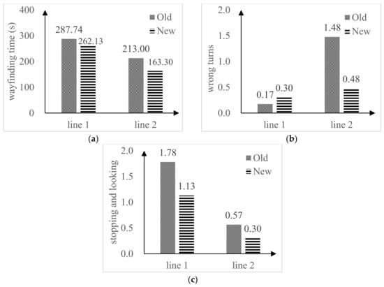 Considering the wayfinding performance, it is obvious that the new signage of integration information plays an important role in the participants’ wayfinding progress. In the environment of the new signage, participants spent less time finding the destination in lines 1 and 2. At the same time, the frequency of wrong turns in line 2 and stopping and looking in line 1 in the new signage scenario was lower than that in the old one. Moreover, there was no difference between the new and old integration information signage in the frequency of wrong turns in line 1 and stopping and looking in line 2.