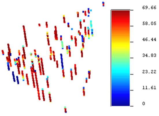 The only attribute that was used in this study is Fe%. The mine authority only records this attribute from the borehole because the iron produced from this mine is of a very high grade, and there are very little impurities present in the ore. The geotechnical study of the deposit proposed a safe bench height of 10 m and a safe bench slope angle of 45°. All boreholes are drilled in a vertical direction. Figure 2 presents a borehole map with down-the-hole rock types. The assay data was composited at 10 m intervals for resource modelling of the deposit. Figure 3 presents the composited point data with their associated assay value within the deposit.
