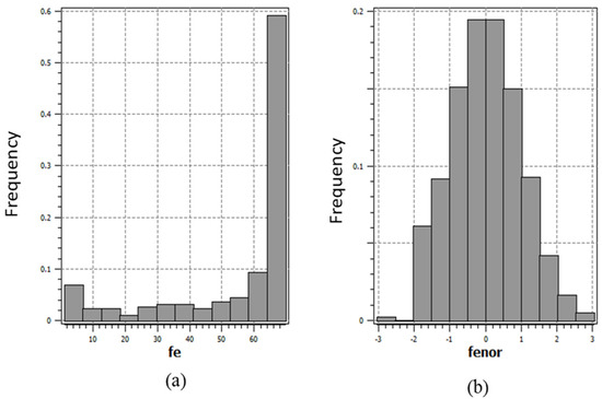 The exploratory data analysis was performed with the composited data set before resource modelling. For resource evaluation purposes, a total of 854 composited data were provided. The descriptive statistics of the composited data show that the iron grade is heavily skewed to the right, with significantly high variance. The frequency distribution of the data set was also prepared using the histogram plot (Figure 4a). The histogram clearly shows the skewness property of the data set. It is seen from the descriptive statistics that the average grade of Fe is 54.9 (%) and the variance is 427.8 (%)2. The K–S goodness of fit test was carried out for the normality checking of the data at 5% level of significance. The result of the K–S test shows that the data are not normally distributed.