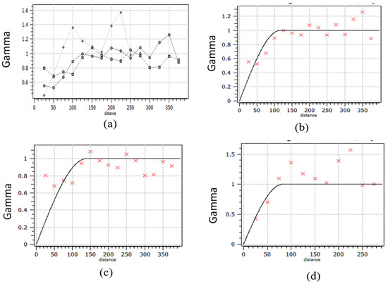 Experimental variogram of all three directions (North, East, up) (a); experimental and fitted variogram model along azimuth 0° (b); experimental and fitted variogram model along azimuth 90° (c); experimental and fitted variogram model along downhole −90° (d).
