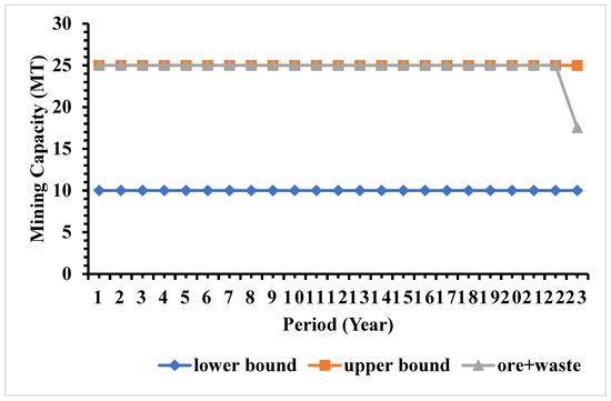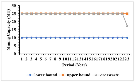 Figure 7 presents material production (i.e., mining capacity) from the deposit during production periods using Model 1. Figure 7 shows that the production from all simulations is similar to the upper limit of the production target from the study mine for all the production periods. The results show that the optimizer tries to maximize the production to generate more cash flow. The results also show that there was no deviation from the production target. The period of production with the desired production target was 23 years.
