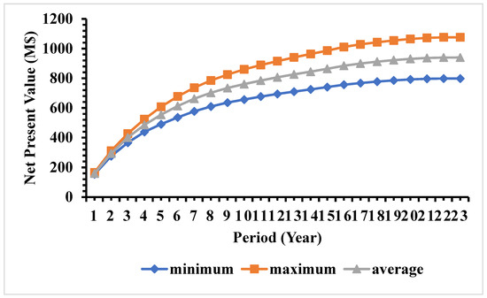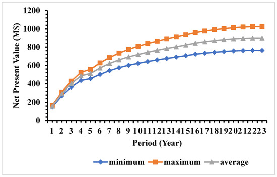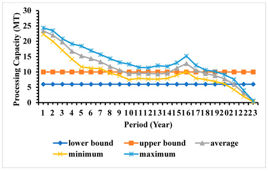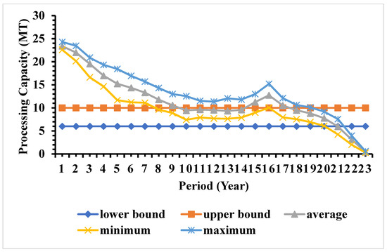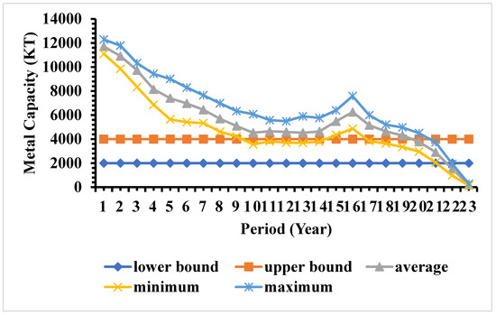 The risk profiles of ore production capacities from different production periods were calculated using Model 1 and presented in Figure 8. For calculating the risk profile, the stochastic production scheduling formulation using multiple block economic was first generated using Model 1. Then, from each of the simulated realizations, the total production was calculated based on the value of decision variables obtained from the production schedule for each period. The minimum, maximum, and average production were calculated from those simulated realizations for all the production periods. It was observed from Figure 8 that the ore production constraint was not respected in the developed schedule over the production periods. During the initial periods of time, the ore production is higher than the target bounds, and, at the later periods, the ore production is lower than the target bounds. This is because the ore production constraint was relaxed with the penalty in the objective function, and, therefore, this constraint was not a hard constraint for stochastic production scheduling formulation. The penalty of the over-production at the initial periods were compensated by producing more metals from the initial period which, in turn, produces more cash inflow during the initial periods. Since the penalty due to the underproduction cannot be compensated, the optimizer tries to delay the underproduction violation, and the underproduction violation was only observed in last three periods of the mine life.