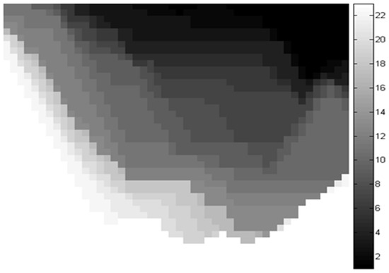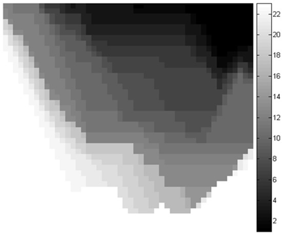 After assigning blocks to different production periods, the discounted cash flow, NPV, and their risk profiles of the deposit were calculated using Model 1 in Figure 10. The expected NPV of the case study mine is 898 million US dollars (M$), with a minimum and maximum NPV of 764 and 1025 million US dollars, respectively. The mining sequence along east–west section of the case study mine is presented in Figure 11. Within the ultimate pit, the total average amount of ore is 265 Mt, and the average amount of metal is 129 Mt. The total amount of materials within the ultimate pit is 568 Mt.