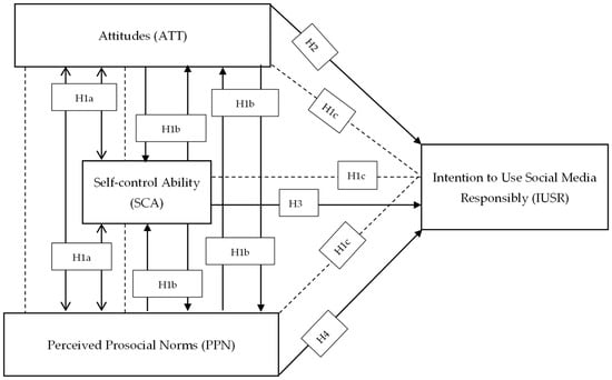 Also, higher SCA may mediate the direct relationship between PPN and intention [129,130]. People with high trait SCA who demonstrated more compliance with prosocial peers led more positive ATT toward COVID-19 vaccinations and were more likely to modify vaccination intention and behavior to help others in the community [80]. However, those researchers urged to investigate whether the exertion of SCA can produce weaker or more robust effects on attitudes in a different context [80]. Overall, the literature reviewed shows that attitudes, self-control ability, and prosocial norms can correlate, affect and mediate their interrelationships with each other and relations with “behavioral intention” in different contexts. So, the current study proposes the following hypotheses in the context of responsible use of social media: