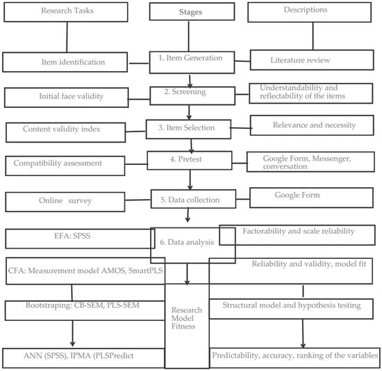Due to a lack of abstract scale in social media literature to measure ASP, the current study followed a systematic process for scale development (see Figure 2 for the detailed research process). Then, it followed the SEM procedures to analyze the collected data [140,141,142,143]. At first, the researchers identified an initial pool of domain-specific items by reviewing a few related research papers. Then to ensure the items’ ability to reflect on what they are intended to measure, the researchers checked the face validity of the items [144,145,146,147,148,149,150] by five students (three male and two female) studying Information Systems at a public university in Bangladesh. The validity checking form included only the constructs’ definition and the items to ensure a bias-free selection of the items [147,149,150,151,152,153,154]. The participants associated the items with their respective constructs by marking them as yes/no [147]. However, three items from each of the SCA, PPN, and IUSR domains were non-representative (See Table 1 for results of face validity and content validity test).
