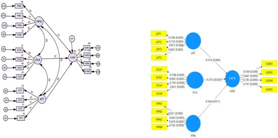 The R2 (see Table 5 and Figure 3 for SEM results) of IUSR as produced by PLSc-SEM/CB-SEM (0.810/0.804) indicates a substantial explanatory power or excellent in-sample predictability of the model [189,210]. The same is true for ATT (0.534), SCA (0.563), or PPN (0.564), as all of their antecedents explain more than 50% of their variances when they are used as endogenous mediator variables. Also, the Q2 for the IUSR with an omission distance of 10 (D) is 0.640, indicating the PLS path model’s substantial predictive accuracy [155,171]. Although ATT (0.360) has a medium, SCA (0.430) and PPN (0.427) have medium to a large predictive accuracy in the model [189,210].