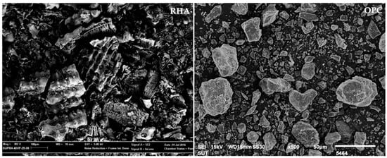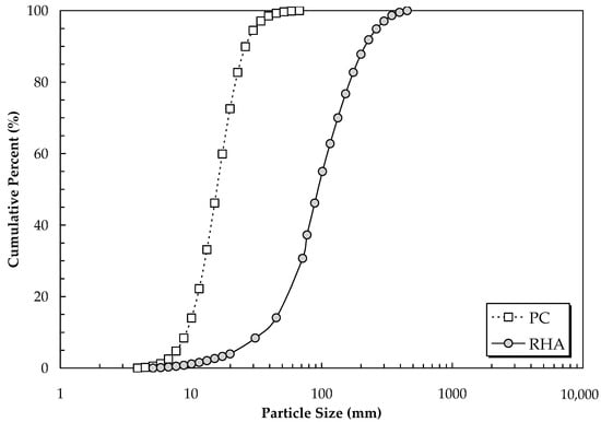 In this work, PC, prepared in accordance with the ASTM C150 [54], was utilized. The specific gravity of the PC was 3.09, and its chemical characteristics are shown in Table 1. CaO was the major ingredient in the PC, accounting for 64.69% of the total. The particle size distribution of RHA and PC is illustrated in Figure 1. The particle size of RHA was greater than that of PC: RHA and PC had median particle sizes of 0.090 mm and 0.015 mm, respectively. The surface of RHA and PC, recorded with the scanning electron microscope (SEM), is shown in Figure 2.