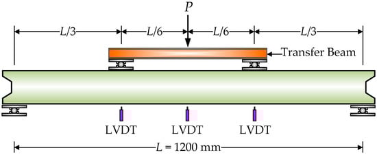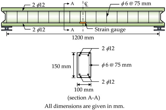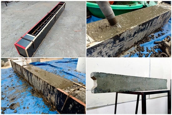 A total of 18 rectangular beams sized 100 mm in width, 150 mm in depth, and 1300 mm in length were cast and subjected to flexural testing. The specimens of the beam were tested using a four-point loading test, with 1200 mm serving as the effective span. Two beams were evaluated for each set, and the experimental results’ average was used for analysis. Figure 3 provides the dimensions, cross-sectional view, and details of the reinforcement layout applied to the beam specimens. All beam specimens were reinforced with 12 mm steel bars at the tension and compression zones with a nominal concrete covering of 25 mm. The 6 mm steel bars were used for vertical stirrups. The spacing of stirrups was set at 75 mm and maintained continuously throughout the beam. The mechanical properties of the steel bars are presented in Table 5. An electrical strain gauge was placed in the middle of the bottom steel bar to determine the flexural strains of longitudinal reinforcement. The beam specimens were cast in timber molds, de-molded after 24 h, and cured for 28 days by plastic wrapping at ambient temperature. The process of beam casting is illustrated in Figure 4. Notches were created on both ends of the beams to perform as shear keys to simulate a precast reinforced concrete beam pattern. Each beam specimen was simply supported on roller assemblies over a 1200 mm clear span and loaded with a hydraulic jack. Figure 5 shows a schematic diagram of the four-point loading test. The displacement transducers (LVDTs) were installed at the mid-span and at the bottom surface of the beam to determine the maximum vertical deflection. During the test, a constant loading rate of approximately 4 kN/min was applied [63,64]. Cracks were marked on beam samples, and the load and deflection were recorded until the beam failed.