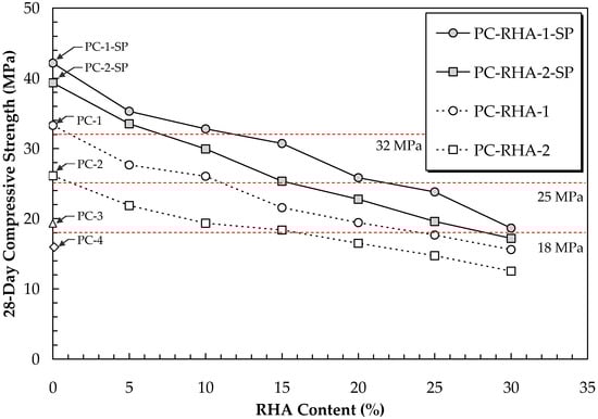 Effect of RHA content on 28-day compressive strength of the PC-RHA.