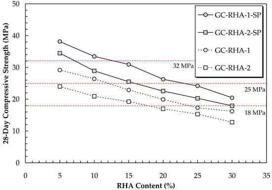 Effect of RHA content on 28-day compressive strength of the GC-RHA.