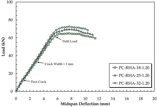 For the PC-RHA beam, the first crack loads of PC-RHA-18-1.20, PC-RHA-25-1.20, and PC-RHA-32-1.20 were 11.4, 12.5, and 13.2 kN, respectively, as shown in Figure 10. The load capacity of the PC-RHA beam, 30%, 20%, and 10% RHA replacement, was 62.0, 63.7, and 65.8 kN, respectively. The corresponding yield deflection was 5.62, 5.50, and 5.43 mm, respectively. As a result of increased RHA replacement in the PC-RHA beam, yield deflection increased. Furthermore, the PC-RHA beam has a load capacity comparable to that of the control PCC beam. The ultimate loads of PC-RHA-18-1.20, PC-RHA-25-1.20 and PC-RHA-32-1.20 were 64.9, 69.5 and 72.5 kN, respectively. The corresponding maximum crack width was 3.7, 3.8 and 4.0 mm, respectively, as shown in Table 6. When compared to the control PCC beam, the maximum crack width of PCC-18-1.20, PCC-25-1.20 and PCC-32-1.20 was 3.6, 3.7 and 3.8 mm, respectively. It has been discovered that the maximum crack width of the two different types of beam is comparable in size.