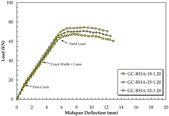 Regarding the GC-RHA beam, the first crack loads were 13.8, 15.0, and 15.9 kN of GC-RHA-18-1.20, GC-RHA-25-1.20 and GC-RHA-32-1.20, respectively, as seen in Figure 11. The load capacity of the GC-RHA-18-1.20, GC-RHA-25-1.20 and GC-RHA-32-1.20 was given at 63.5, 65.4 and 67.1 kN, respectively. The corresponding yield deflection was 5.79, 5.60 and 5.52 mm, respectively. It is also demonstrated that the yield deflection increased as RHA replacement increased in the GC-RHA beam, which is similar to the PC-RHA beam test results. Moreover, because the GC-RHA mixture had a greater 28-day compressive strength than the PC-RHA mixture, the GC-RHA beam had a slightly higher load capacity than the PC-RHA beam. The ultimate loads of GC-RHA-18-1.20, GC-RHA-25-1.20 and GC-RHA-32-1.20 were 67.3, 70.8 and 74.4 kN, respectively. The corresponding maximum crack width was 3.1, 3.0 and 3.1 mm, respectively, or 84, 80 and 78% of the PC-RHA beam. The results are consistent with Saranya et al. [73], who reported that the geopolymer concrete beam had a smaller maximum crack width than that of the Portland cement concrete beam.
