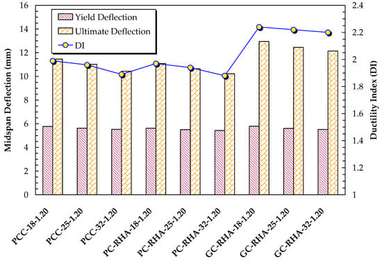 where and are the ultimate and yield deflection, respectively. Figure 14 shows the yield deflection, ultimate deflection, and DI of the RC beam specimens. The DI values for the control PCC beam, PCC-18-1.20, PCC-25-1.20, and PCC-32-1.20 were 1.99, 1.98 and 1.89, respectively. For the PC-RHA beam, the DI values of PC-RHA-18-1.20, PC-RHA-25-1.20, and PC-RHA-32-1.20 were 1.97, 1.94 and 1.88, respectively. The DI of the two types of beams was similar in value. As a result of increased compressive strength in the control PCC and PC-RHA beams, DI decreased. In contrast, the DI values for the GC-RHA beam, GC-RHA-18-1.20, GC-RHA-25-1.20 and GC-RHA-32-1.20 were 2.24, 2.20 and 2.00, respectively. This shows that the GC-RHA beam is more ductile than the control PCC and PC-RHA beams [73]. Moreover, Aldemir et al. [80] described how the bond strength of the matrix and aggregate phase directly affects beam ductility. Sarker [81] and Cui et al. [82] also found that the bond strength of geopolymer concrete for the same test parameter was higher than that of Portland cement concrete. In direct pull-out tests, Fernandez-Jimenez [83] and Zhang [84] discovered that the bond strength of reinforced geopolymer concrete is greater than that of Portland cement concrete. These findings are in agreement with the results of Sarker [81].