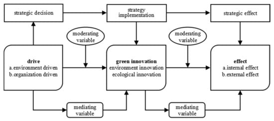 In the field of green innovation, some scholars have carried out research from the perspective of institutional theory, and analyzed the impact of environmental regulation, environmental supervision and green development policies on enterprise green innovation [6,7,8]; some scholars, from a resource-based perspective, have discussed the impact of knowledge base, knowledge sharing, and knowledge absorption capacity on enterprise green innovation [9,10,11]; and, from the perspective of managers’ characteristics and stakeholders, some scholars have verified the relationship between a CEO’s personal characteristics, a manager’s environmental attention, stakeholder pressure and enterprise green innovation [12,13,14]. It is not hard to see that scholars at home and abroad have approached the issue of green innovation from different perspectives, and the results have been fruitful. Special attention has been paid to the drivers and effects of green innovation, but the fragmentation of research conclusions also brings certain challenges to more in-depth research in the future. For one thing, the existing research has obtained some contradictory conclusions on the same type of influencing factors from different theoretical perspectives [15,16]. How to understand the theoretical mechanism and boundary conditions behind these research conclusions? For another, scholars have carried out in-depth research on different types of influencing factors, but there is very little discussion in the literature about the relationships between the different factors. Is there a relationship between different types of influencing factors? How can one efficiently promote enterprise green innovation in practice? In order to deal with these challenges, it is necessary to systematically sort out the different types of drivers and effects, research conclusions, theoretical mechanisms and possible research hypotheses of green innovation in the existing research, with a view to providing support for further theoretical exploration and innovation in the field of green innovation in the context of China.