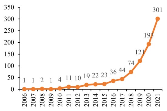 The sample data we studied came from the core database of Web of Science. Firstly, the core collection was selected by using the basic retrieval function of Web of Science database, and a rough retrieval was carried out with “green innovation”, “environmental innovation”, “ecological innovation” as the keywords. Then, the literature type “Article” was selected with the time of “2006–2021” by using the refining function of the database to clean the data. A total of 863 articles were screened out, and their years of publication are shown in Figure 2. Figure 2 shows an upward trend indicating that it has become a hot topic.