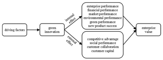 The strategic effect brought by the implementation of green innovation is another important issue of concern to theoretical researchers and practical subjects. Therefore, we established the strategic effects of adopting green innovation in enterprises as shown in Figure 3. Under the influence of driving factors, enterprises carry out green innovation practice, which brings internal and external strategic effects, so as to realize the increment of enterprise value [81]. Enterprise value is the discounted value of the estimated future cash flow that an enterprise can create.