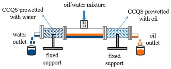 In total, 4 g of corn cob of a 400 mesh (0.0385 mm) was added into 100 mL of 9% NaOH solution, stirred at 1600 r/min for 12 h, and then ultrasonic shocked for 2 h with an ultrasonic cleaner of 40 kHz. The mixture was then centrifuged at 4000 r/min for 3 min after being ultrasonically dispersed for 2 h. The corn cob was washed with distilled water until the pH was 7. It was then dried at 60 °C to generate the activated corn cob. To create a uniform dipping solution, the activated corn cob was mixed with 100 mL of anhydrous alcohol, 2 g of waterborne polyurethane, and magnetic stirring for 4 h. In total, 20 g quartz sand was immersed into the dipping solution for 48 h, then screened out, and dried in an oven at 60 °C for 48 h. The result was a corn-cob-coated quartz sand with underwater superoleophobic qualities and underoil extremely hydrophobic qualities (hereafter referred to as CCQS).