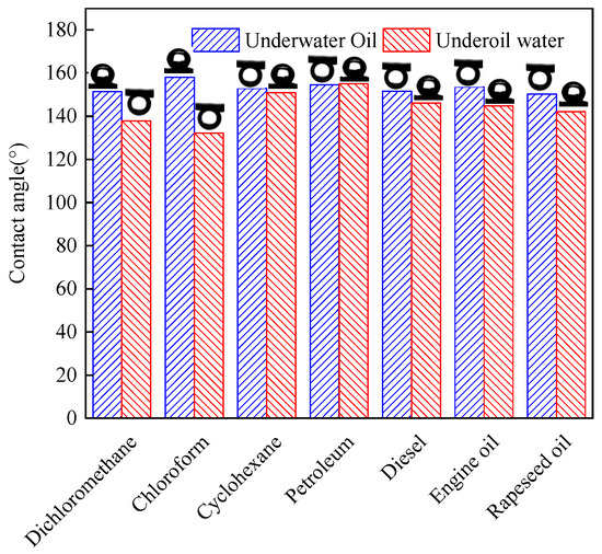 In Figure 2, seven different types of oil static contact angles with the surface of the CCQS are displayed. Airborne water and oil droplets soon dispersed and completely soaked the quartz sand. The contact angle between the oil and water was 0°. The corn cob coating on the quartz sand had both superhydrophilic and superoleophilic properties in the air, because it included amphiphilic groups such as hydroxyl, carboxyl, etc. The underwater oil and underoil water contact angles of the unmodified quartz sand were 125° and 100°, respectively. As can be seen from Figure 2, the underwater oil and the underoil water contact angles with the CCQS were, respectively, 150.3~154.6° and 132.2~154.6°, achieving the level of underwater superoleophobic qualities and underoil extremely hydrophobic qualities.