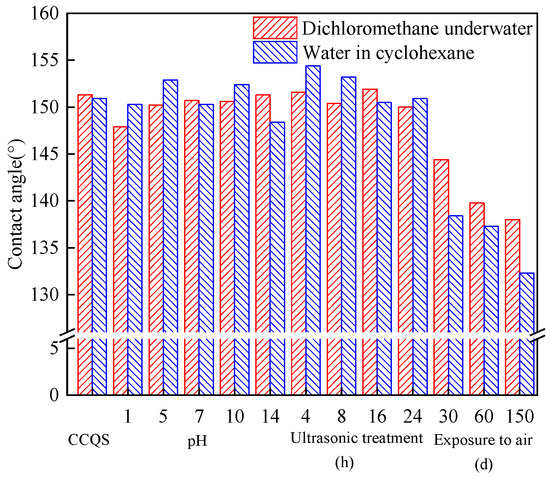 Stability is a crucial consideration when using ultra-wettable materials. The result of the stability is shown in Figure 3. The mechanical wear characteristics of the quartz sand could be assessed using ultrasonic oscillation [34]. Figure 3 shows that the underwater oil and underoil water contact angles of the CCQS were both above 150° after ultrasonic shocking of 4 h, 8 h, 16 h, and 24 h, stating that the CCQS had strong mechanical wear resistance. When the CCQS was soaked in a strong acid solution of pH = 1 and in a strong alkali solution of pH = 12, the contact angle of the CCQS underwater oil decreased from 151.3° to 147.9° and 150.9° to 148.4°, respectively. In other cases, the contact angles of the CCQS were both above 150°. When the CCQS was placed in air, the contact angle descended with the extension of time. At 150 d, the contact angles of the underwater oil and underoil water decreased from 151.3° to 138° and from 150.9° to 131.4°, respectively; the possible reason is that the grafted corn cob on the surface of the CCQS fell off a little. The study demonstrated that the CCQS had a strong ability to resist harsh environments [24].
